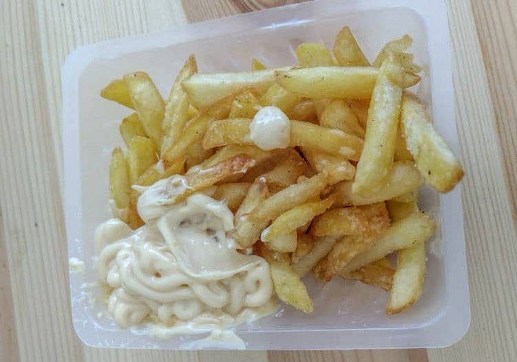 Er werd lekker friet gebakken en een portie friet voor 1 € met Mayonaise daar hadden we wel zin in