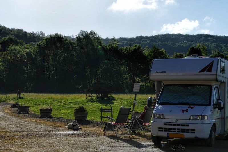 En gaan naar de camperplek van camping de Fuussekoul ,we waren er om 4 uur ,in maart konden we nog buiten in de zon zitten nu 6 juni is het koud en kil ,gelukkig wel droog
