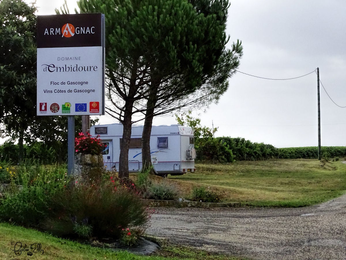 we vertrekken rond 10 uur we zien een camperplaats aangegeven bij Lavardac,ojee dat is schrikken goed voor alles te doen..(gratis) en dan vlug wezen ,nog te slecht om een boterham te eten,en dan staan er mensen dagen ..Niet ons idee van op pad zijn,wat eens velden vol zonnebloemen waren in de Gers is zo zielig,alle koppies hangen (doet het in heel Frankrijk) ...maar daar zien we nog een paar zonnebloemen we zijn op weg weer naar een wijnboer ,van Floc de Gasconne en Armagnac in Rejaumont