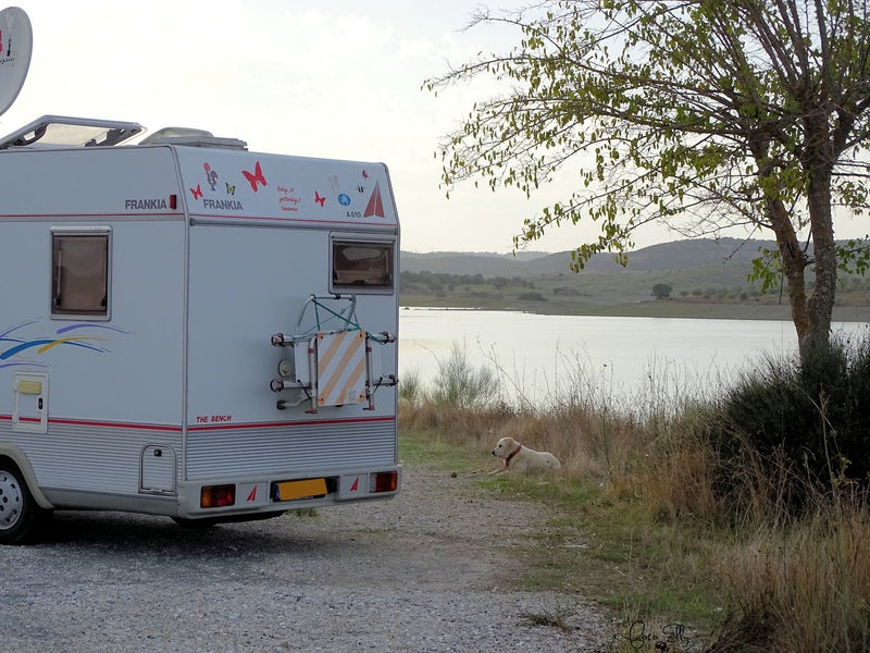 Was een relaxte tijd in Serpa ,en nu gaan we eerst tanken in Spanje en een nieuwe gasfles halen...daarna gaan we een stukje noordelijker na een mooie rit naar het stuwmeer van Alqueva bij het plaatsje Estrela...op de parkeerplaats zelfs is geen verzorging in het dorpje is water te krijgen bij het openbaar toilet.