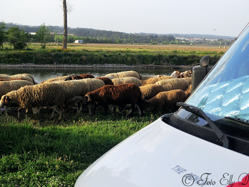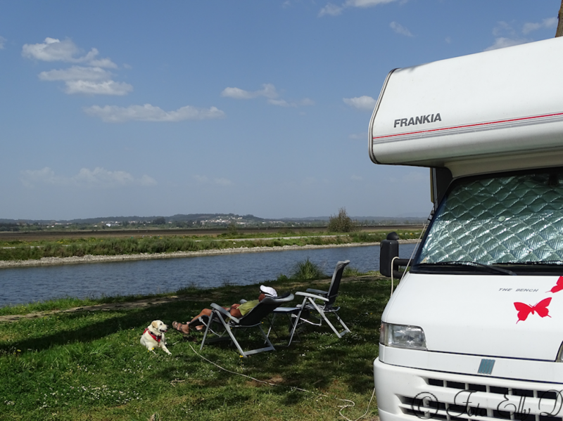 We gaan weer verder richting Coimbra,er is daar een camperplek ,maar het is nog zo warm en benauwd en wilden niet opgeprikt staan ..we zoeken ons eigen plekje en waar??? aan de roeibaan net buiten Montemor O Velho,geen zin om te klimmen naar het mooie castello,maar hangen onder een boom aan het water....wat een ruimte!!! `s avonds kwamen de schapen langs ,heel veel ooievaars om ons heen.meet mijn buurvrouw.