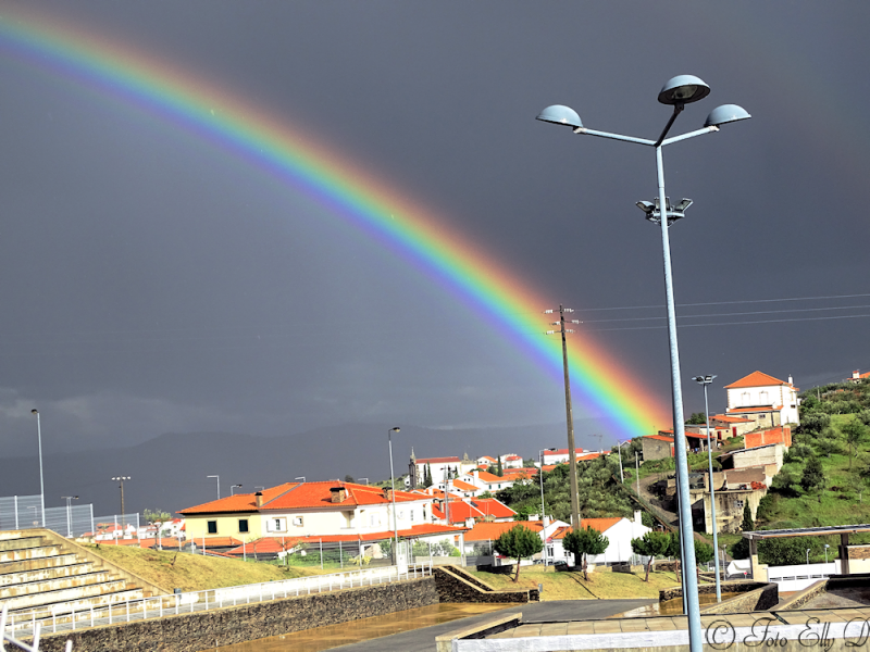 We hebben overnacht in Freixo Espada a Cinta..Gratis camperplek met elektriciteit..is de poort niet open ,die kun je dan zelf opentrekken ..en wat hadden we een mooie regeboog na een plensbui