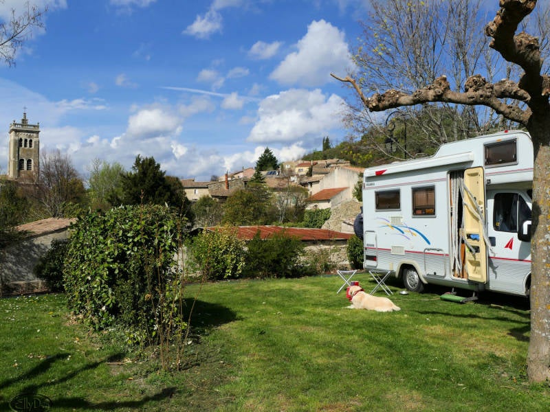 we lunchen op een camperplek bij St Marting d-Londres, camperplek is goed genoeg om te eten en voor alles te legen en water te pakken.