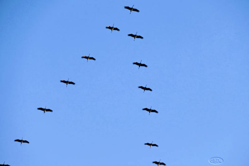 En hoog boven in de lucht vlogen de kraanvogels terug van de overwintering
