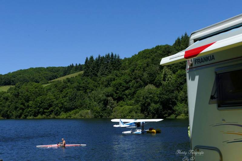 En dan gebeurt het ,al veel meegemaakt caravans met een auto komen op de campings ,campers,auto`s met tentjes ,maar met een watervliegtuig???? En dan aanleggen en met een waterfiets naar de kant komen....nee dit is nieuw !!