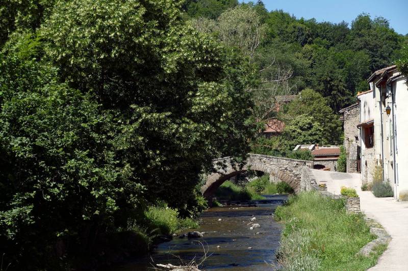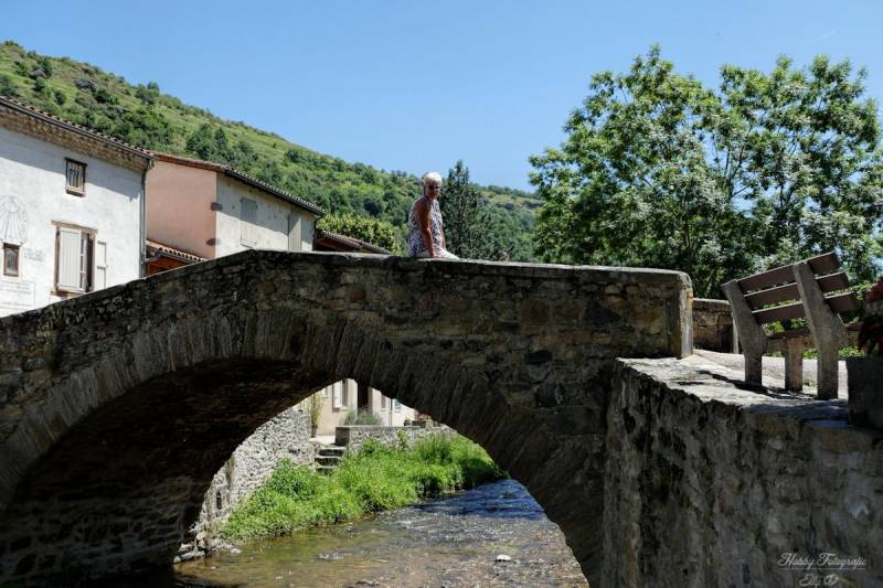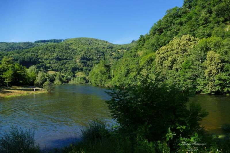 Vlak voor Lempdes sur Allignon zien we een bordje links af Beau village Blesle....we wilden er al een keer heen ,laten we het maar gelijk doen en zogezegd zo gedaan, Er is een camperplaats,sta je gratis aan de rivier, en we konden de camper fijn in de schaduw neerzetten. Floor heeft geen zin meer in wandelen met warmte door oude dorpen .Dakluiken open en schaduw dan blijft het voor haar ook koel