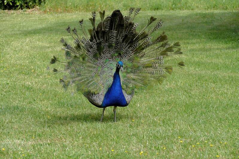 Een jonge pauw die net voor het eerst zijn veren kreeg en er probeerde er indruk mee te maken op Floor