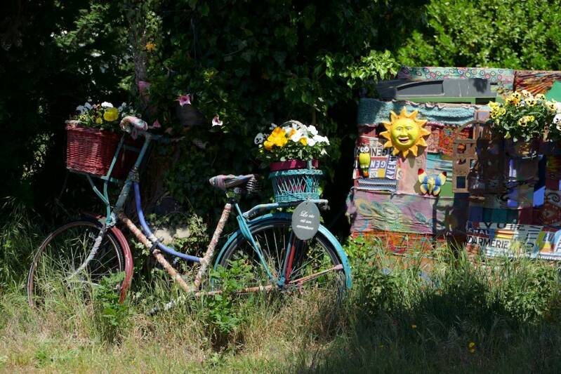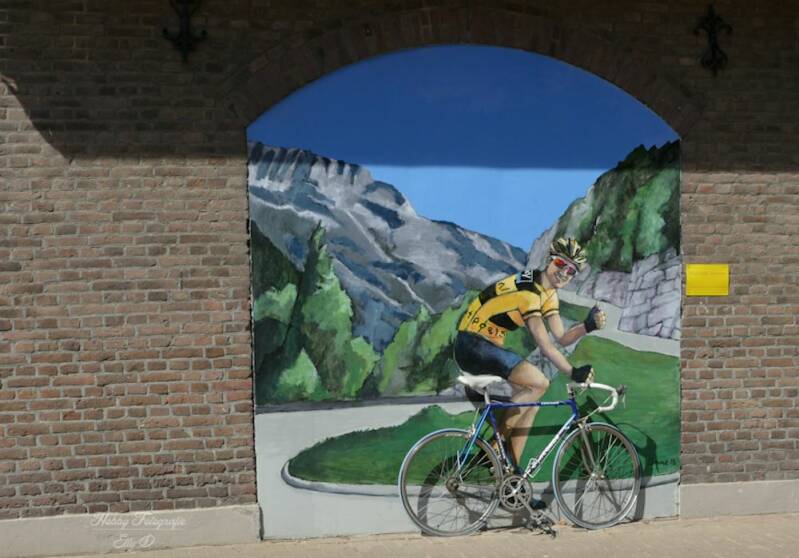 In een dorp komen we deze muurschildering tegen van Wout Poels...leuk gemaakt met de fiets ervoor.
